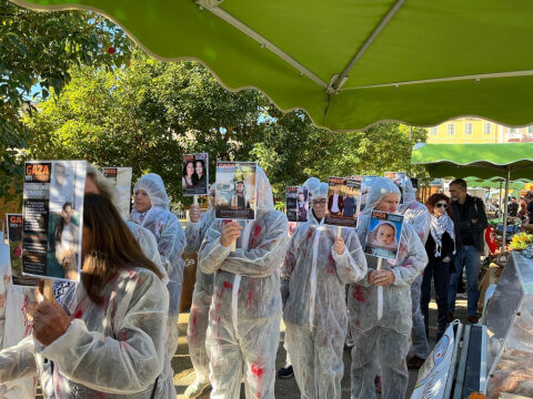 Evènement "GAZA des Visages - pas que des Nombres" " Style Happening" sur le marché d'Ajaccio. Mis en scène par Jean Michel ROPERS et Pat O'BINE, Déambulation en combinaisons blanches maculées de sang, avec des affichettes devant le visage pour dénoncer le génocide en cours en Palestine.